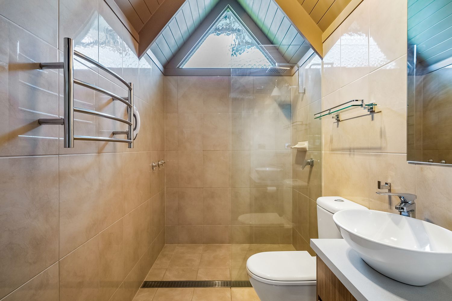 + Main bathroom is unique with raked ceilings, tasteful fittings throughout and featuring a stylish large triangle-shaped window