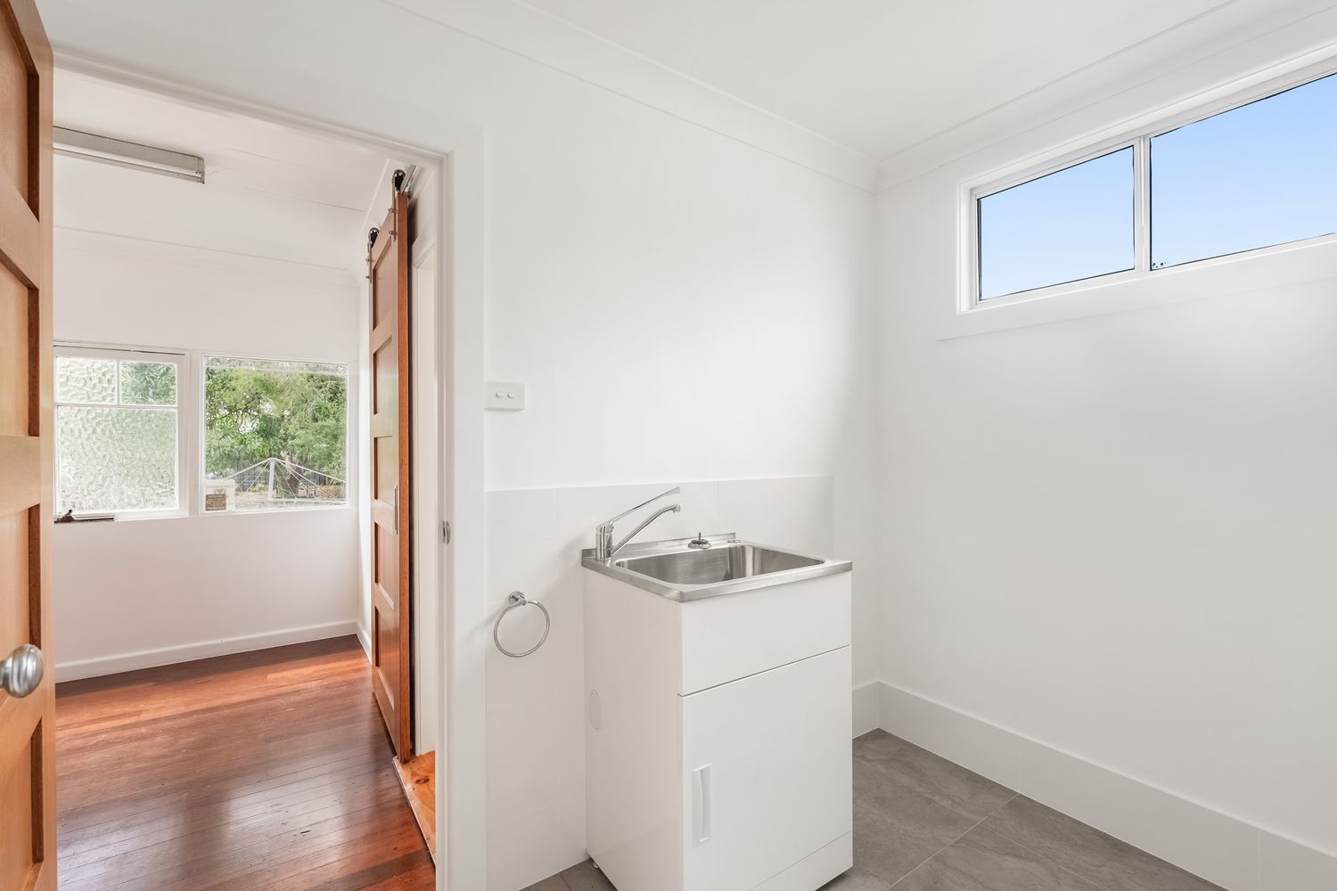 + A country-style barn door opens to a generous contemporary bathroom, adjoining a large internal laundry with a walk-in linen press and a separate toilet