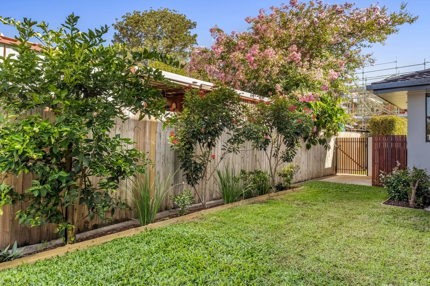 + Inviting outdoor entertaining area, partially covered with a raked lifted roof, flowing seamlessly onto a level, beautifully landscaped, fully fenced north-facing backyard