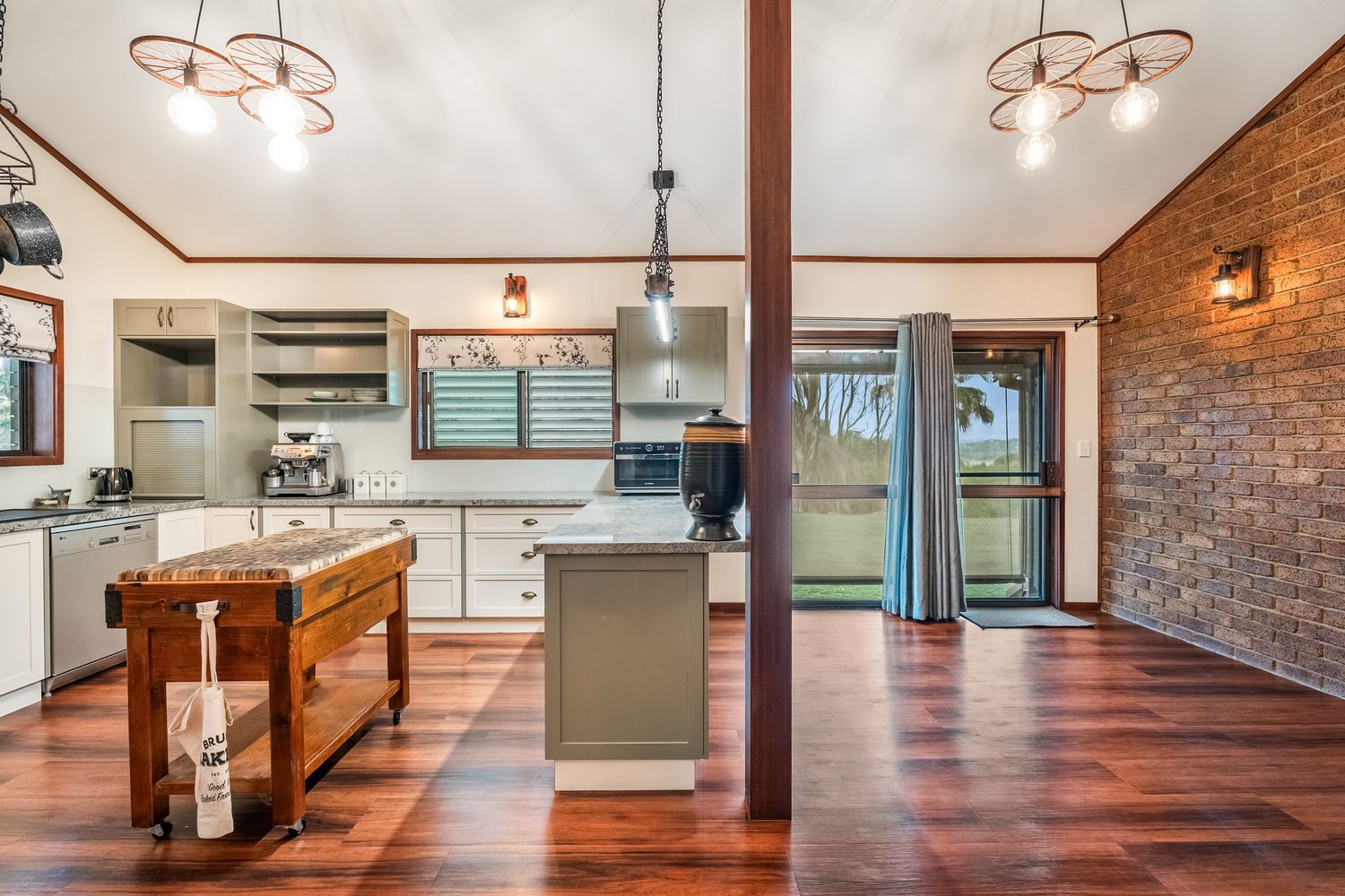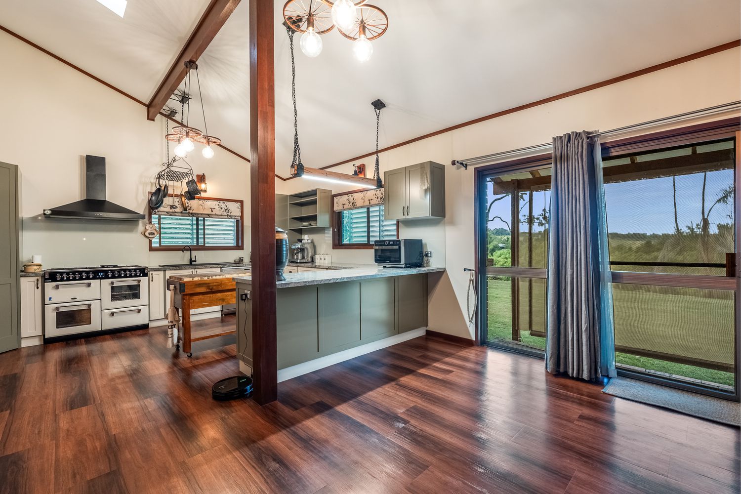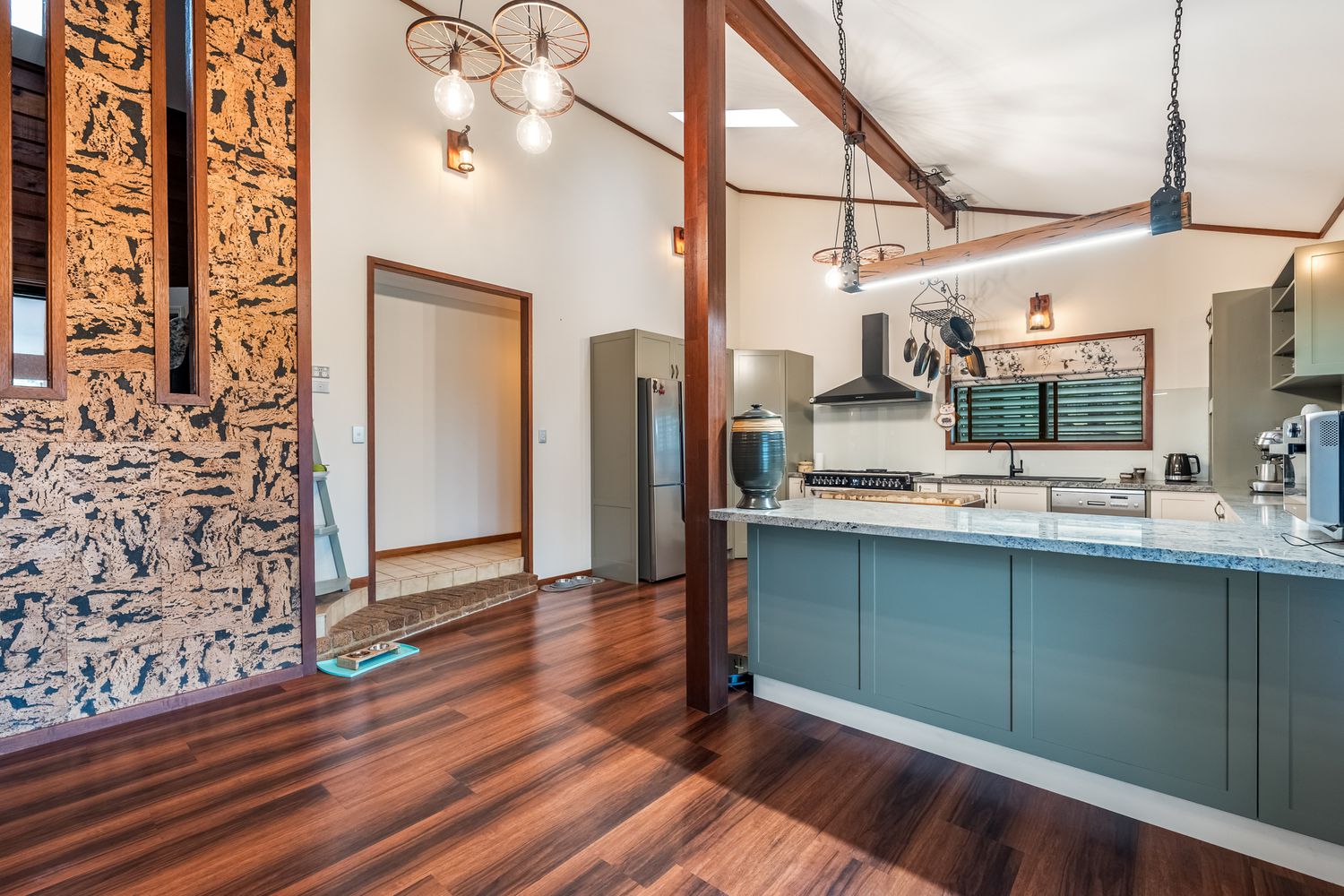 + At the heart of the home, the modern kitchen combines style and functionality with granite benchtops, a gas cooktop, ducted range hood, dishwasher and walk-in pantry, complemented by a timber island bench, breakfast bar, exposed beam ceiling and designer skylight lighting
