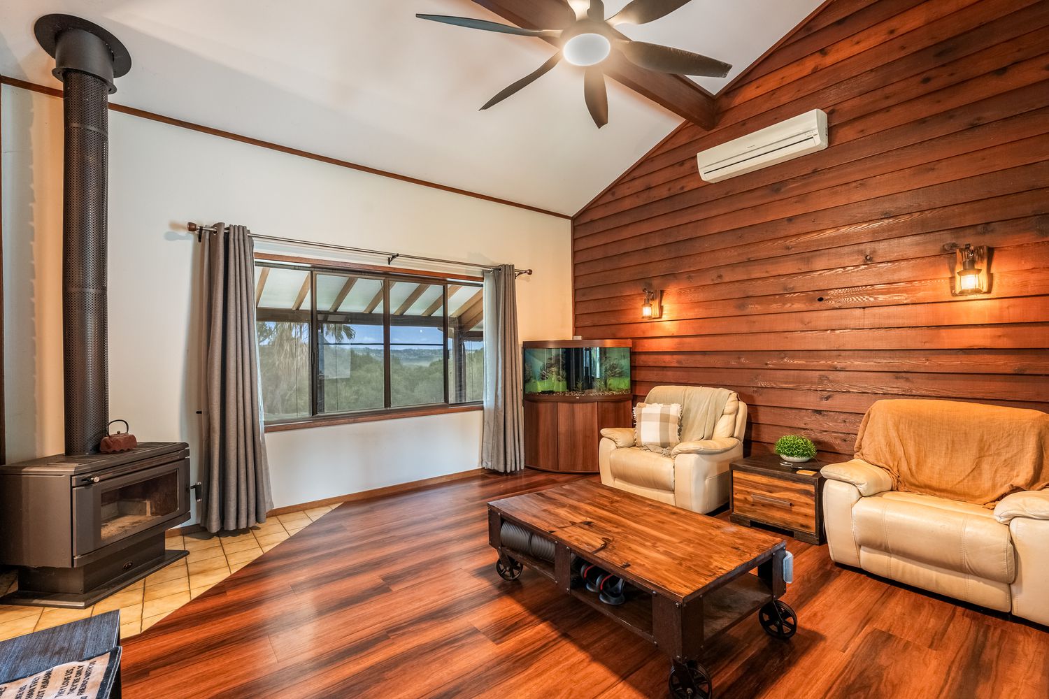 + The sunken lounge room creates a welcoming focal point, enhanced by soaring ceilings, a cosy fireplace and air-conditioning for year-round comfort