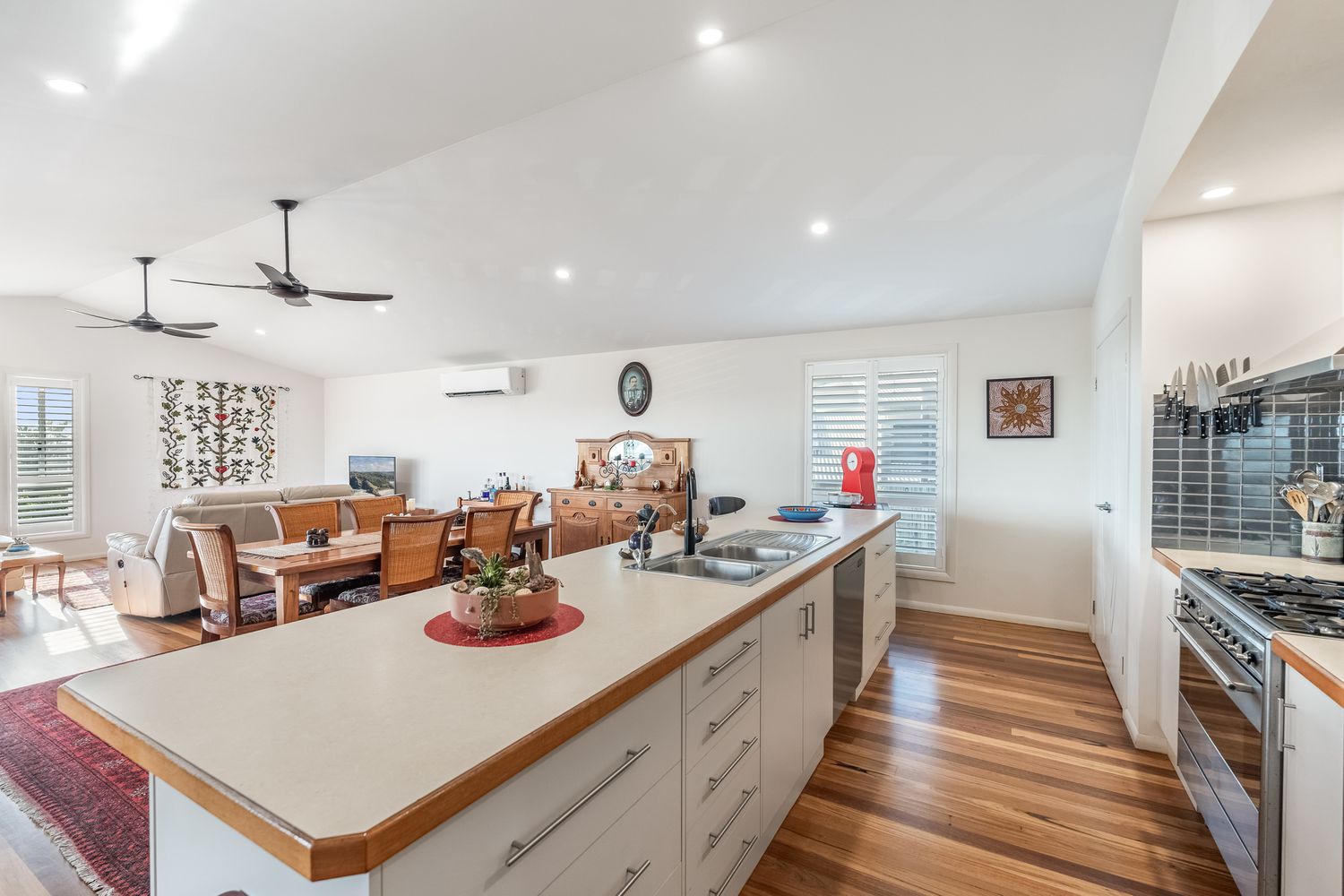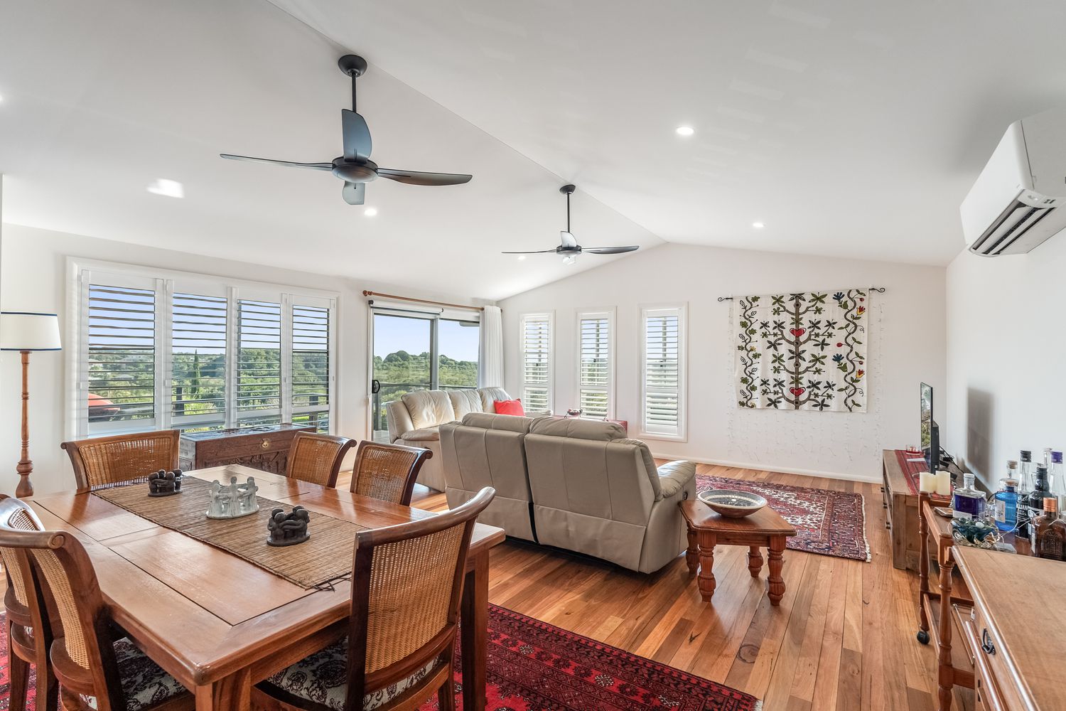 + Effortless open-plan central living area with those beautiful views - encompassing the living, dining, and kitchen spaces, enhanced by high raked ceilings, air conditioning, ceiling fans, plantation shutters, hardwood timber floors and access to the deck, while creating seamless indoor-outdoor living