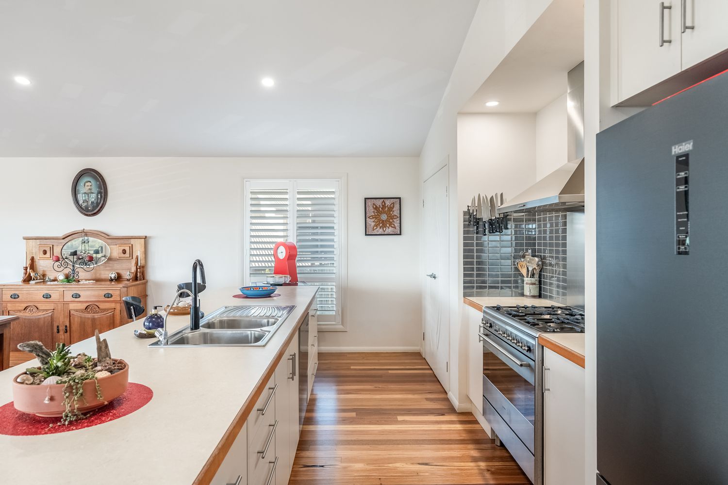 + The well-appointed kitchen is neat and functional, featuring a 900mm gas cooktop and oven, a dishwasher, and a spacious island bench that provides adequate preparation space and casual seating for family and guests