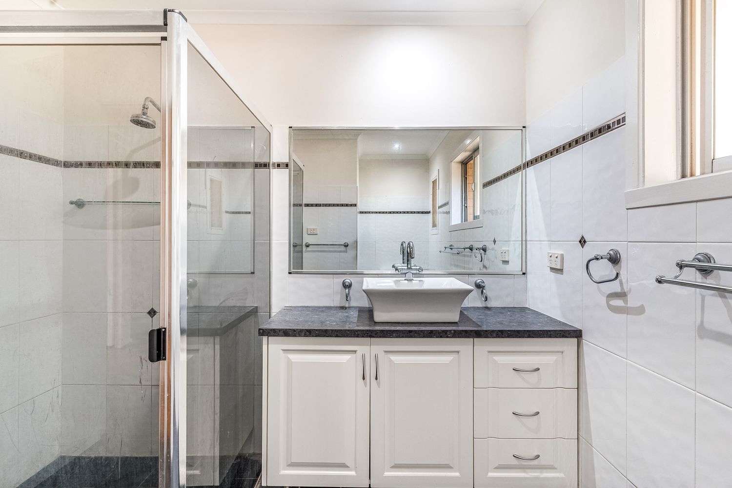 + Neatly updated bathroom with modern finishes, including shower and toilet